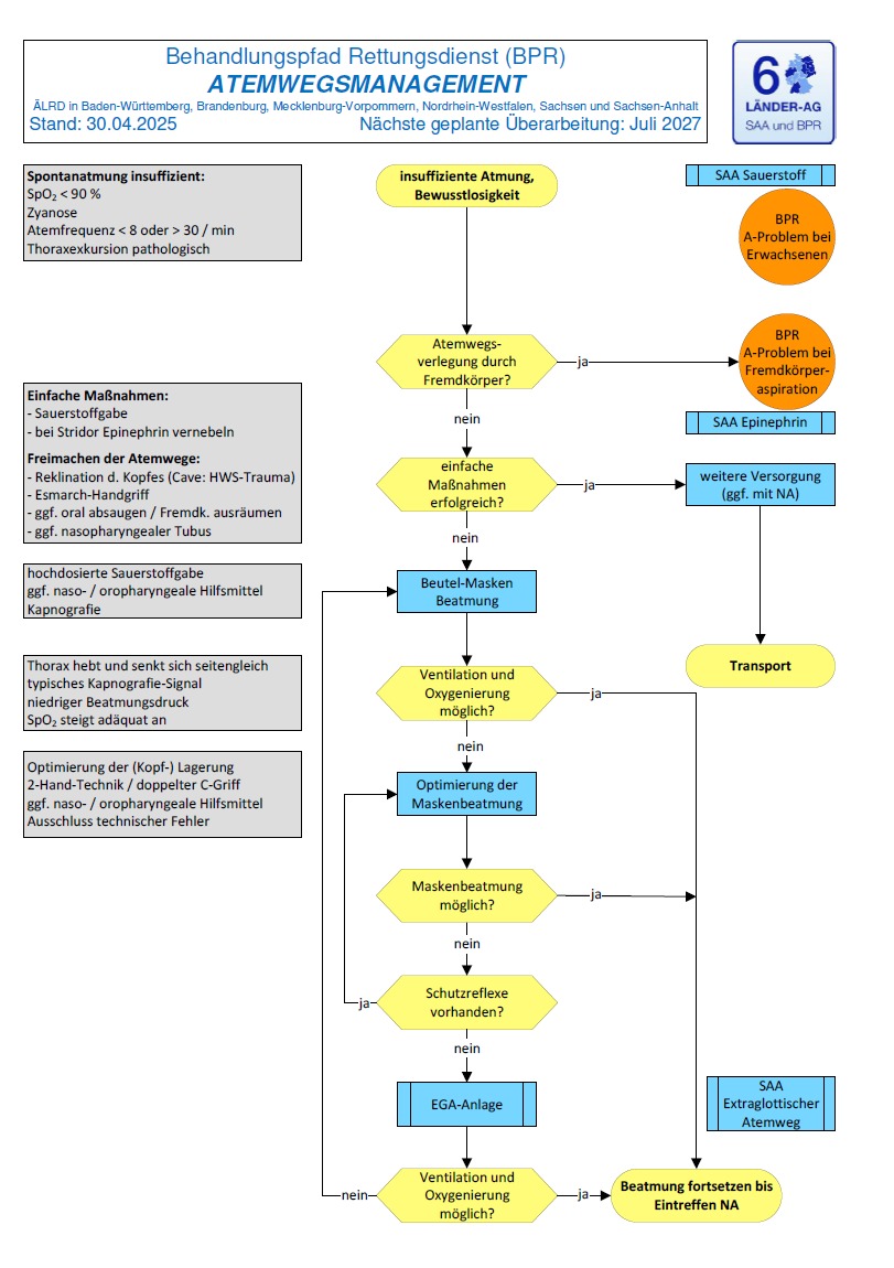 Eine wesentliche inhaltliche Neuerung ist, dass das Atemwegsmanagement nicht mehr nur verstreut in einzelnen Algorithmen mitläuft, sondern als eigener Behandlungspfad mit klarer Zielsetzung formuliert ist: Vorrangig sollen Oxygenierung und Ventilation sichergestellt und Hypoxie möglichst früh verhindert werden. Der BPR beschreibt dabei ausdrücklich ein zügiges, systematisches und eskalierendes Vorgehen, das mit Basismaßnahmen beginnt und bei Bedarf bis zur Anwendung extraglottischer Atemwegshilfen führt.