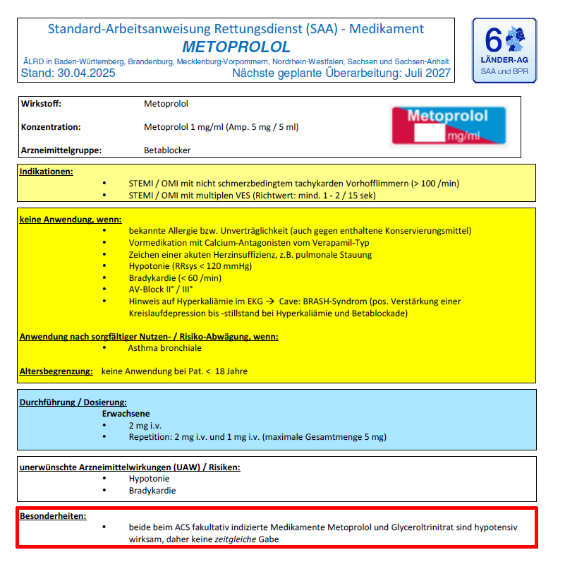 Ein besonders praxisrelevanter Hinweis betrifft die Kombination mit Glyceroltrinitrat: Da beide Medikamente beim ACS fakultativ indiziert und hypotensiv wirksam sind, soll keine zeitgleiche Gabe erfolgen.