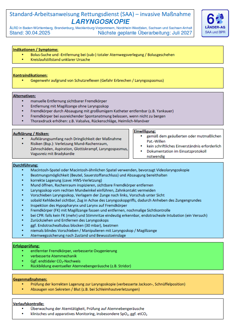 Eine relevante Änderung ist auch die stärkere Einbindung der SAA Laryngoskopie in konkrete A-Probleme. Im BPR A-Problem bei Fremdkörperaspiration wird bei schwerer Atemwegsverlegung die unmittelbare Laryngoskopie mit Fremdkörperentfernung, etwa mittels Magillzange oder gezieltem Absaugen, beschrieben. Wenn vorhanden, soll dabei ein Videolaryngoskop verwendet werden.