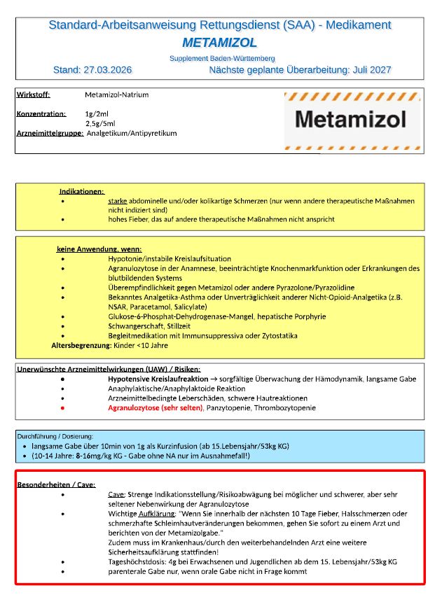 Für den Rettungsdienst ist das eine wichtige Erweiterung. Das verbessert die Standardisierung und erhöht zugleich die Verantwortung: Wer Metamizol gibt, muss Indikation, Kontraindikationen, langsame Gabe, Kreislaufüberwachung und Aufklärung mitdenken.