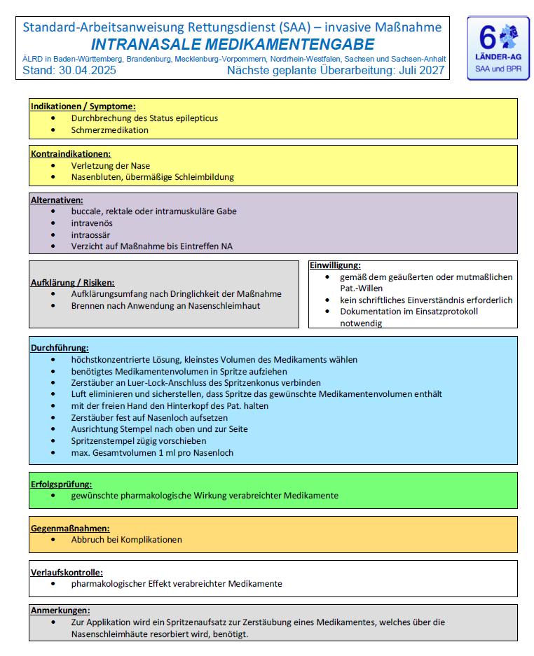 Mehrere Medikamente können in der SAA/BPR 2025 über zusätzliche Applikationswege intranasal und intramuskulär eingesetzt werden. Das betrifft insbesondere den Bereich Analgesie, Sedierung und Krampfanfalltherapie.