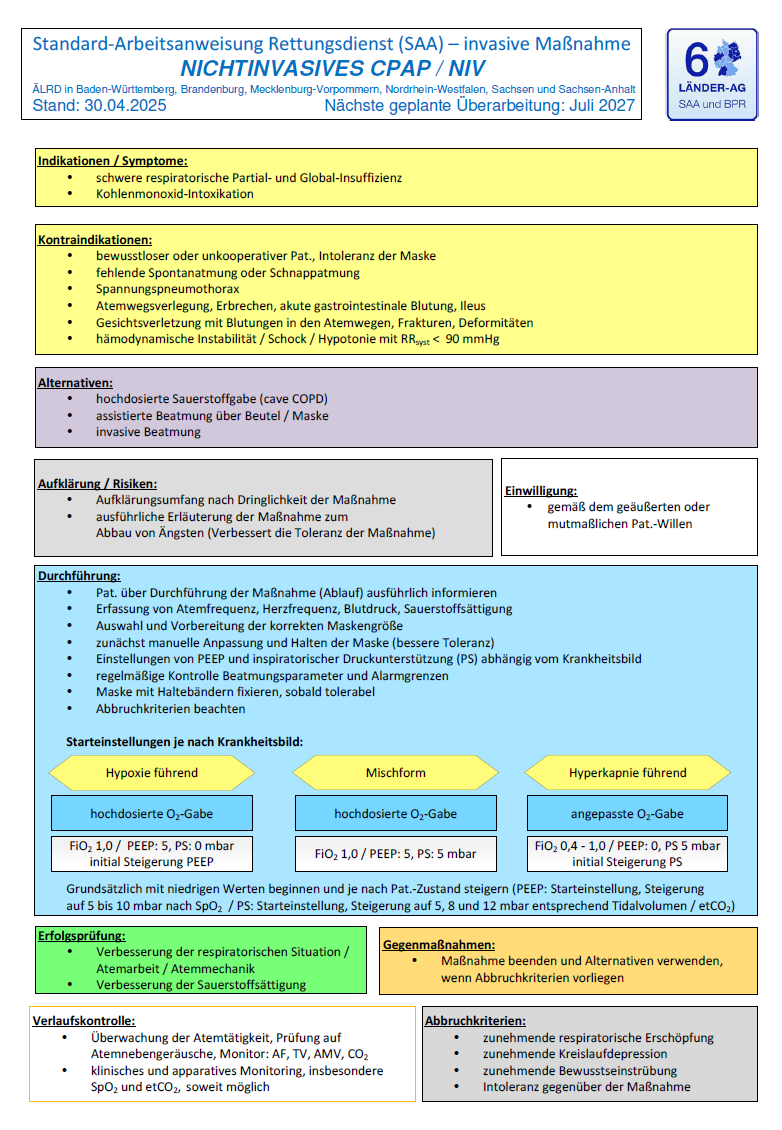 Beim kardialen Lungenödem wird die rasche Anwendung von CPAP bzw. PEEP ausdrücklich hervorgehoben; bei anderen Dyspnoe-Konstellationen wird zwischen führender Hypoxie und führender Hyperkapnie unterschieden und die Atemunterstützung entsprechend ausgerichtet. Das verbessert die praktische Zuordnung von CPAP und NIV zu konkreten Krankheitsbildern.