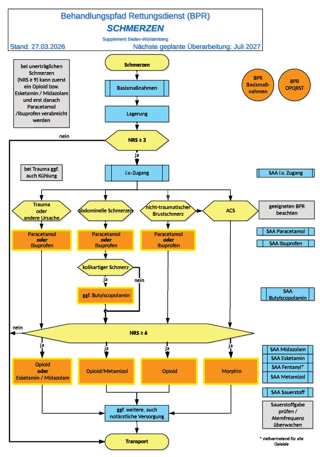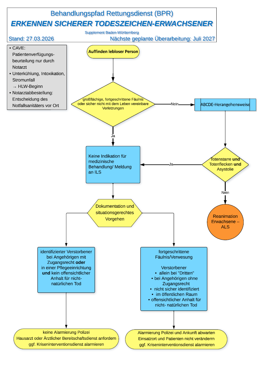 Mit dem Supplement Baden-Württemberg werden einzelne Inhalte der SAA/BPR 2025 für die rettungsdienstliche Praxis konkretisiert und ergänzt. Im Fokus stehen vor allem die Notarztnachforderung, das Erkennen sicherer Todeszeichen, der ALS-Algorithmus nach ERC 2025, die strukturierte Schmerztherapie sowie die Anwendung von Metamizol im Rettungsdienst.