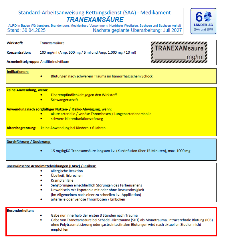 Für die praktische Anwendung besonders wichtig ist das enge Zeitfenster: Die Gabe soll nur innerhalb der ersten 3 Stunden nach Trauma erfolgen. Gleichzeitig grenzt die SAA die Anwendung bewusst ein. Für ein isoliertes Schädel-Hirn-Trauma, eine intracerebrale Blutung ohne Polytraumatisierung oder gastrointestinale Blutungen wird die Gabe nach aktueller Studienlage nicht empfohlen.
